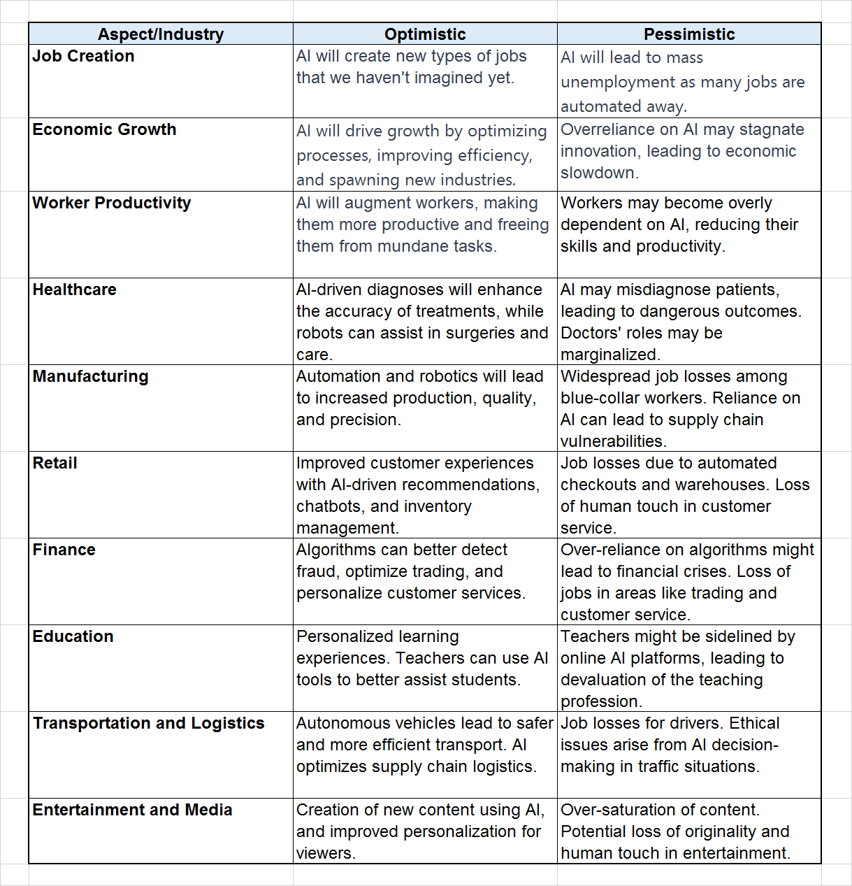 ChatGPT: G'day Kevin, I just went through the article you sent and the additional table comparing the optimistic and pessimistic views of AI in different sectors. It’s fascinating stuff.